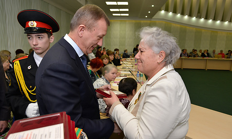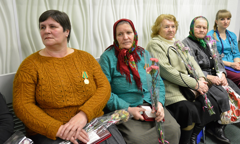 Губернатор Николай Денин, председатель Брянской области Владимир Гайдуков и главный федеральный инспектор по Брянской области Леонид Соломатин вручили женщинам памятные медали «70 лет освобождения Брянской области».