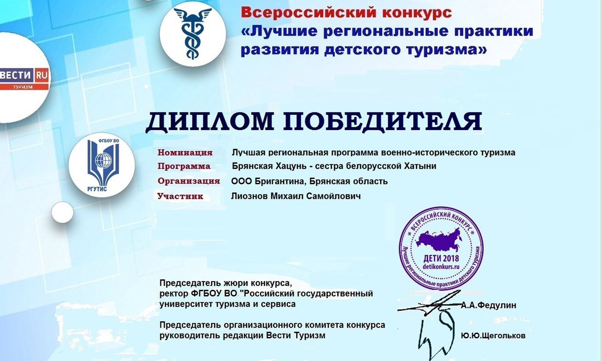 Брянская турфирма «Бригантина» заняла первое место в номинации «Лучшая региональная программа военно-исторического туризма» с проектом «Брянская Хацунь — сестра белорусской Хатыни».