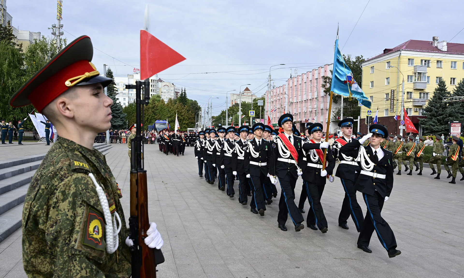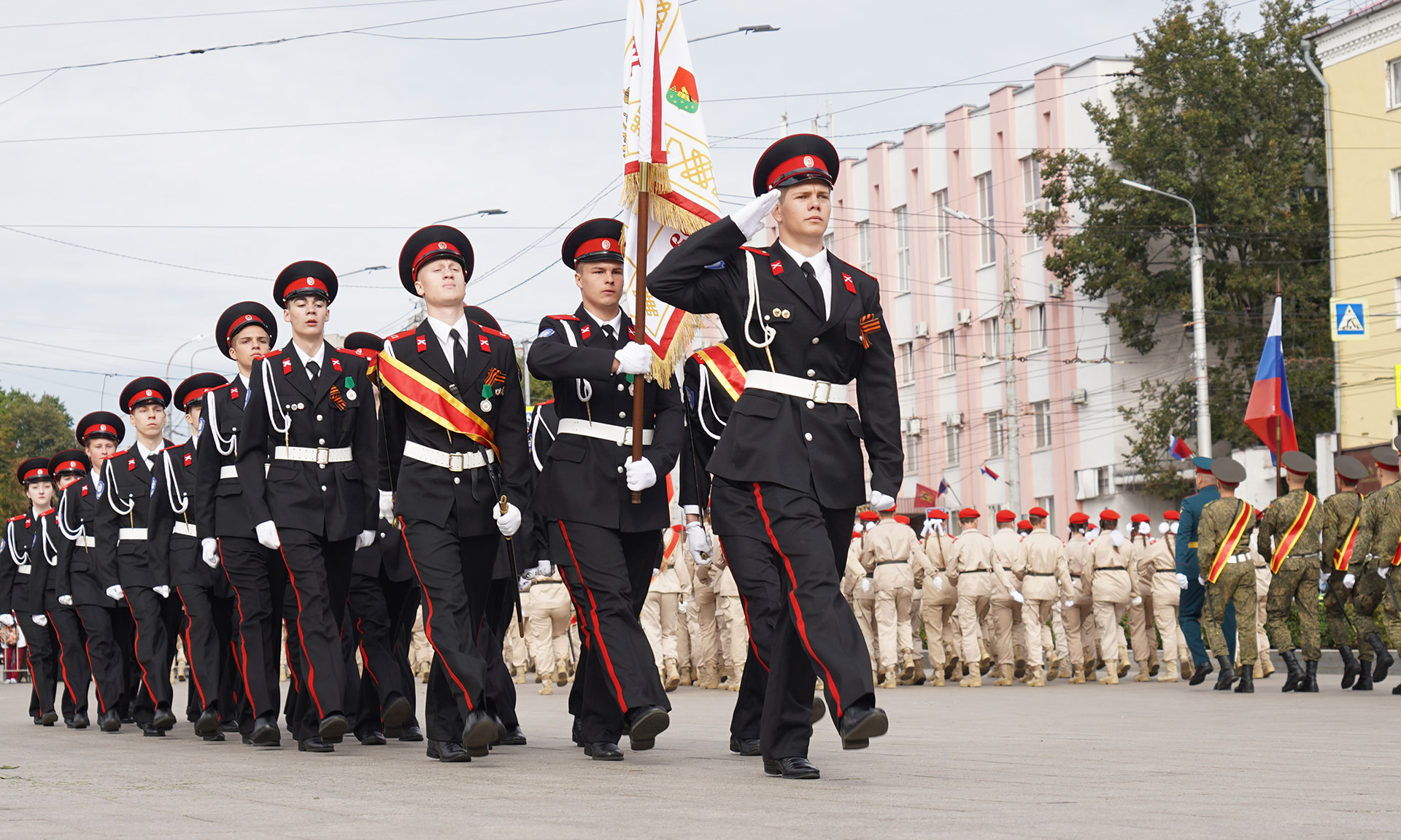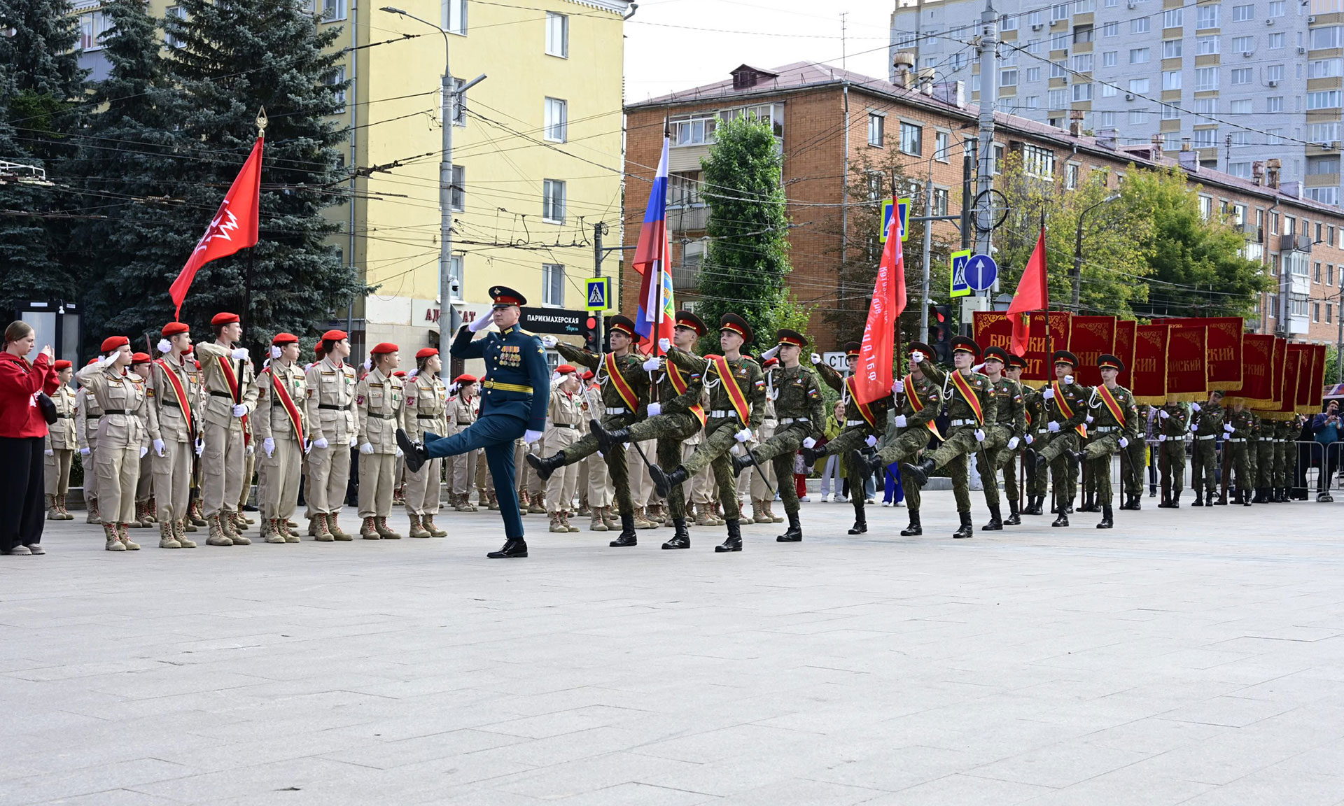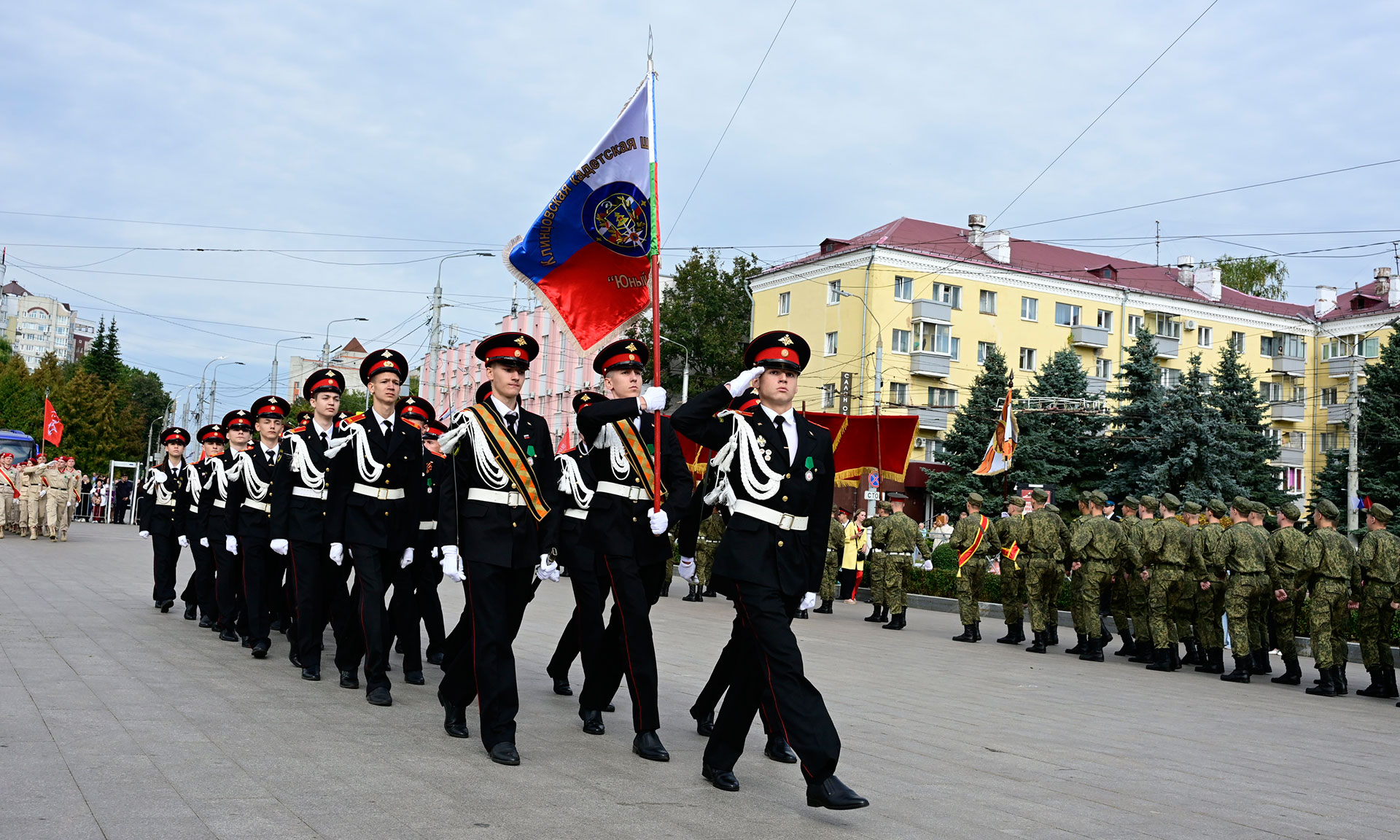 В парадном строю — курсанты военного учебного центра, парадный расчет Брянской кадетской школы имени Героя России В. И. Шкурного, Дятьковской кадетской школы имени Героя Советского Союза И. А. Кашина, казаки-кадеты лучшего казачьего кадетского корпуса Российской Федерации по итогам Всероссийского смотра-конкурса 2025 года. Уже в октябре в Кремле кадеты получат переходящее знамя Президента России!