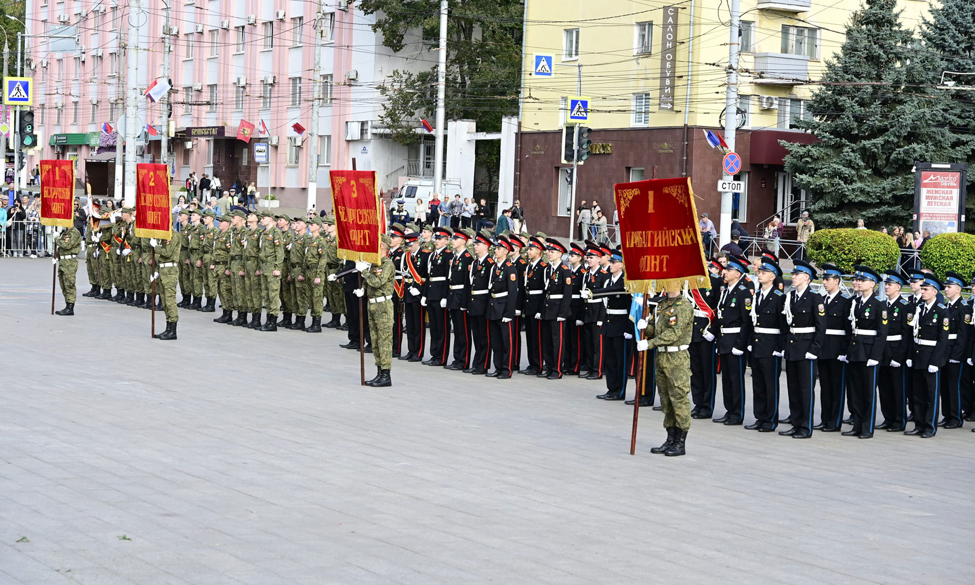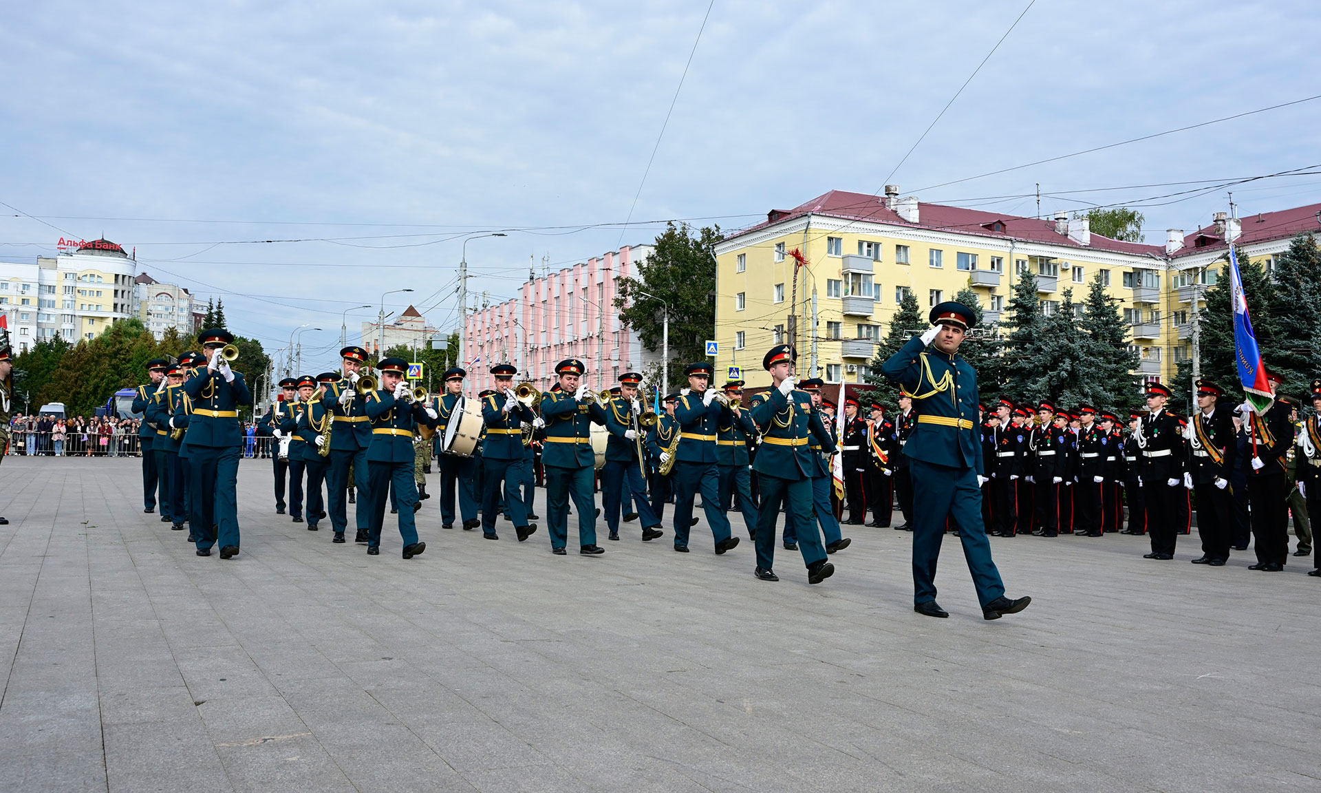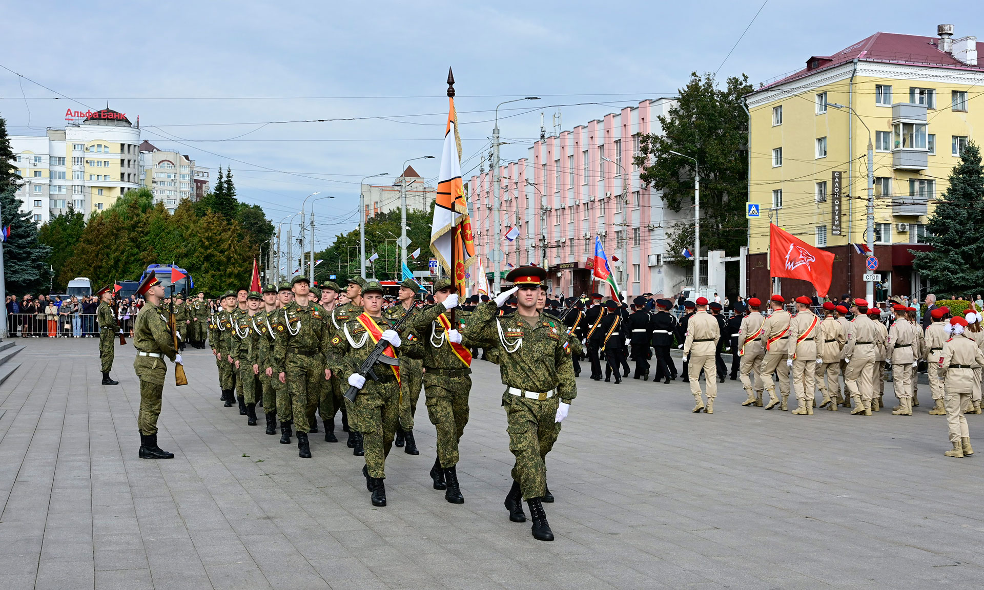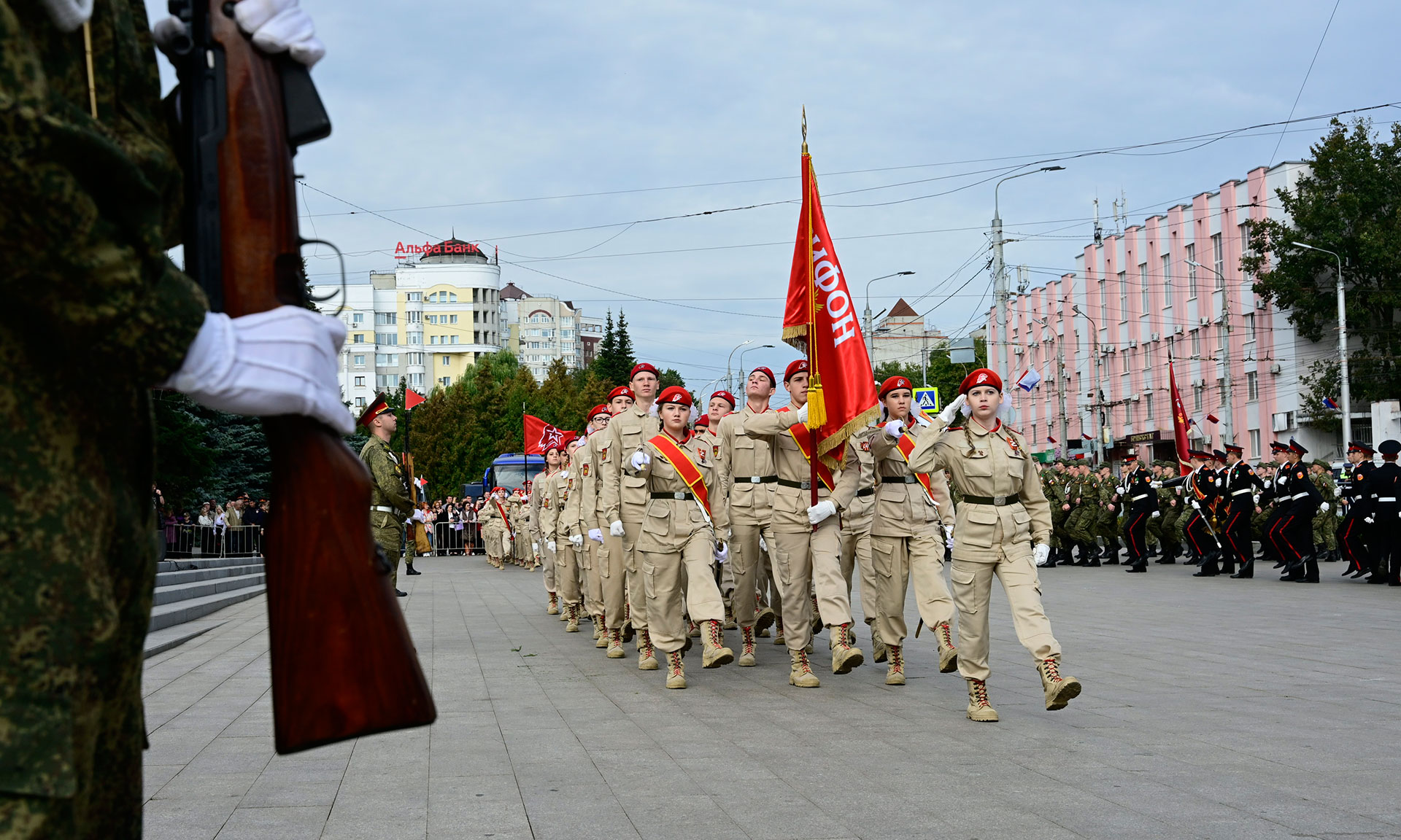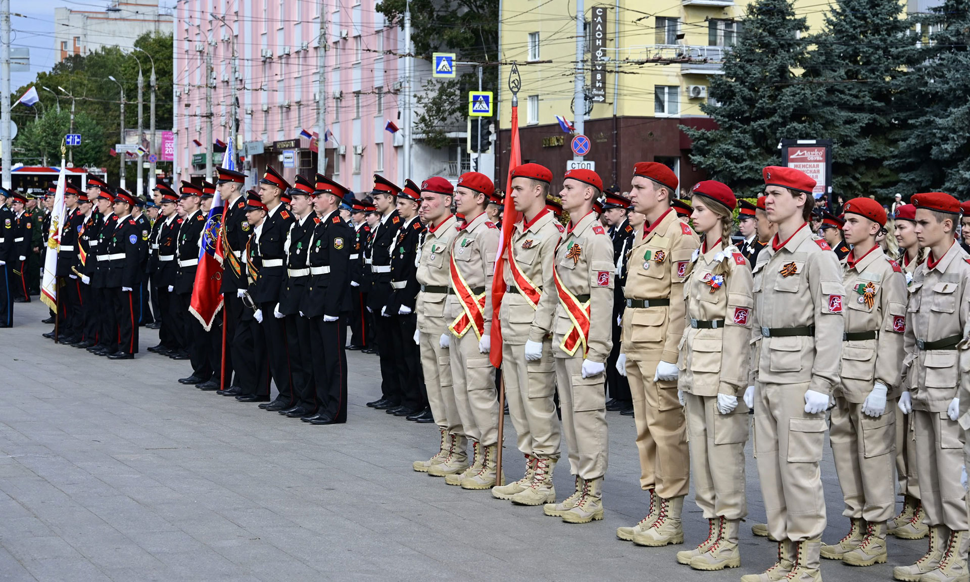 В парадном строю — курсанты военного учебного центра, парадный расчет Брянской кадетской школы имени Героя России В. И. Шкурного, Дятьковской кадетской школы имени Героя Советского Союза И. А. Кашина, казаки-кадеты лучшего казачьего кадетского корпуса Российской Федерации по итогам Всероссийского смотра-конкурса 2025 года. Уже в октябре в Кремле кадеты получат переходящее знамя Президента России!