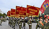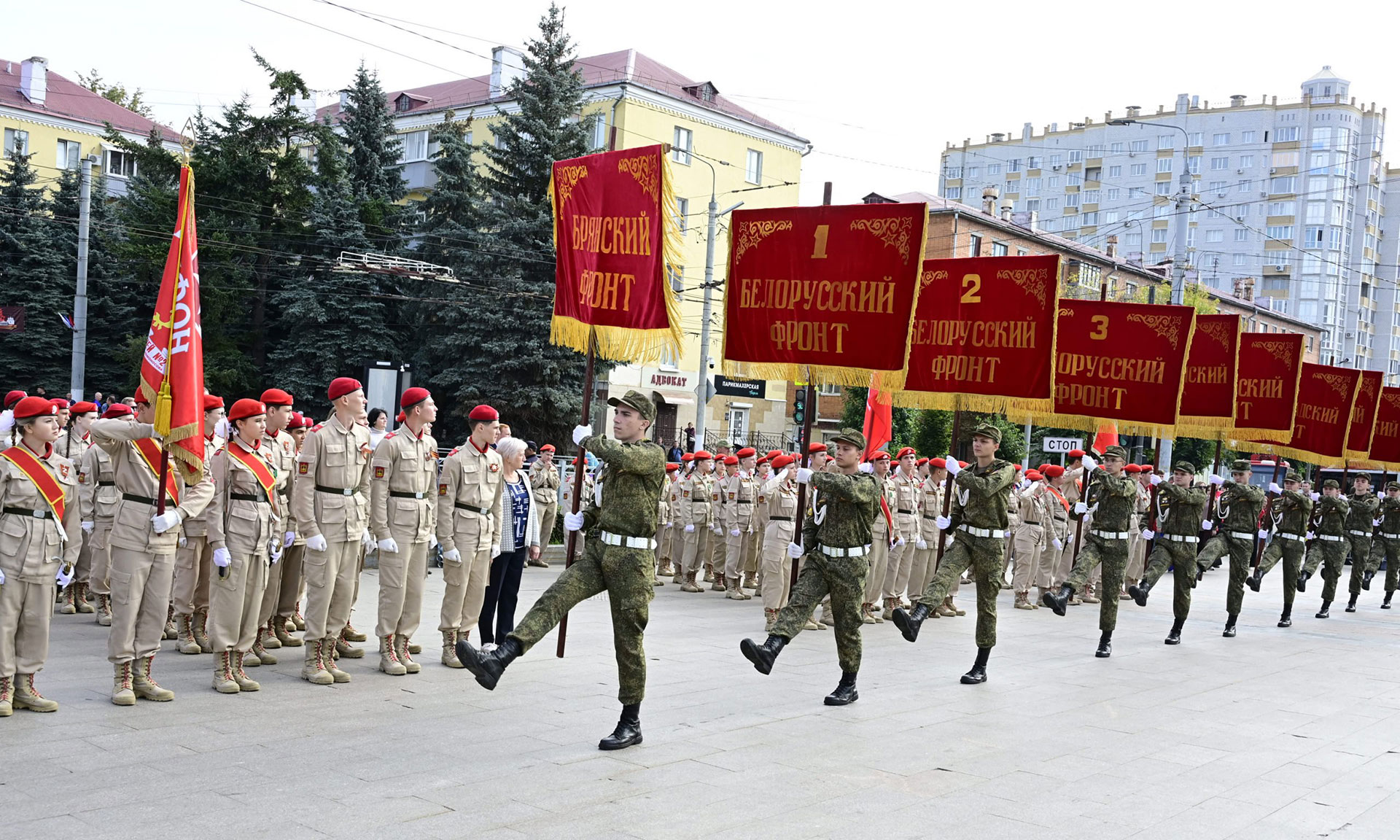 На площадь Партизан были внесены Государственный флаг Российской Федерации, копия Знамени Победы и флаг Брянской области. В парадном марше на Площади Партизан — штандарты фронтов и соединений, освободивших нашу Родину. Наименования этих фронтов золотыми буквами вписаны в историю России. Они символизируют доблесть, честь и отвагу защитников нашей Родины. Штандарты несли продолжатели славных воинских традиций — курсанты военного учебного центра Брянского государственного инженерно-технологического университета.