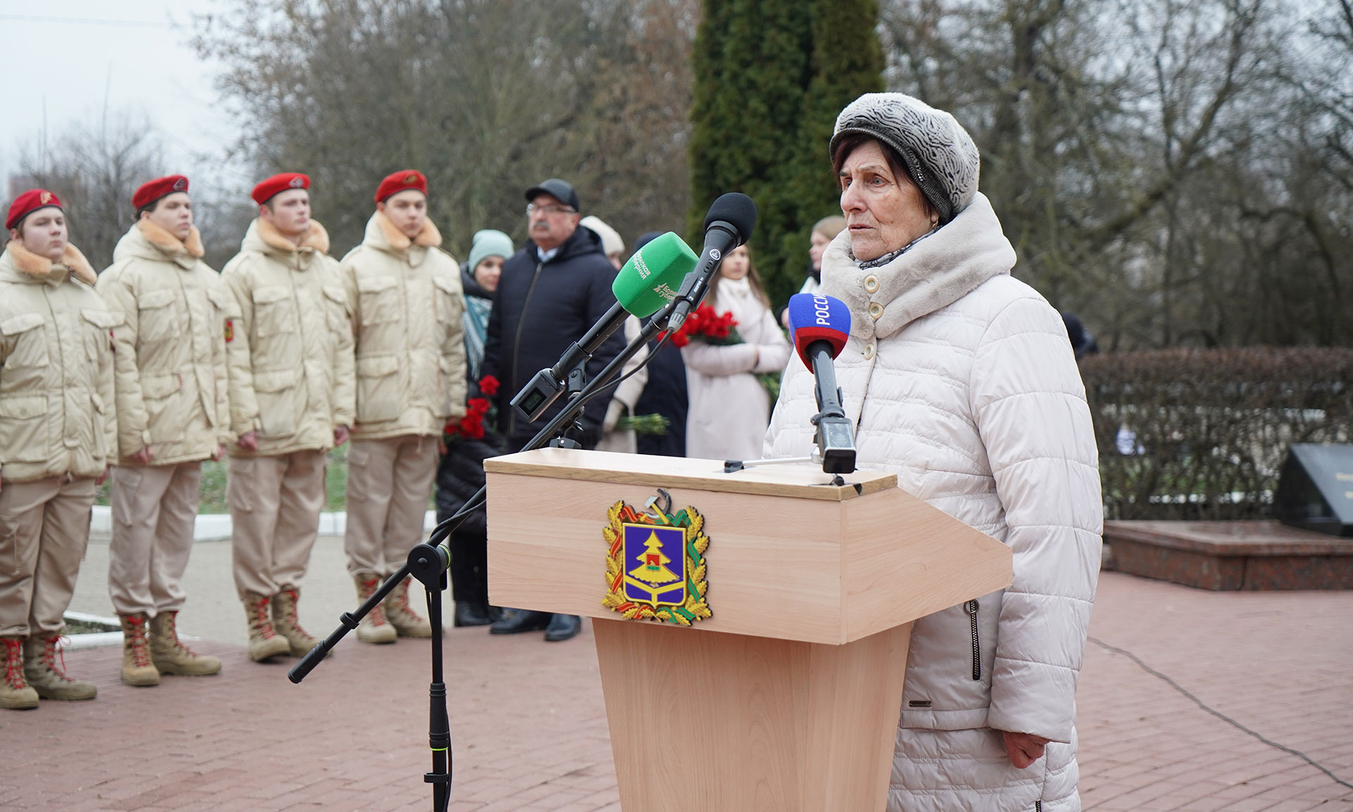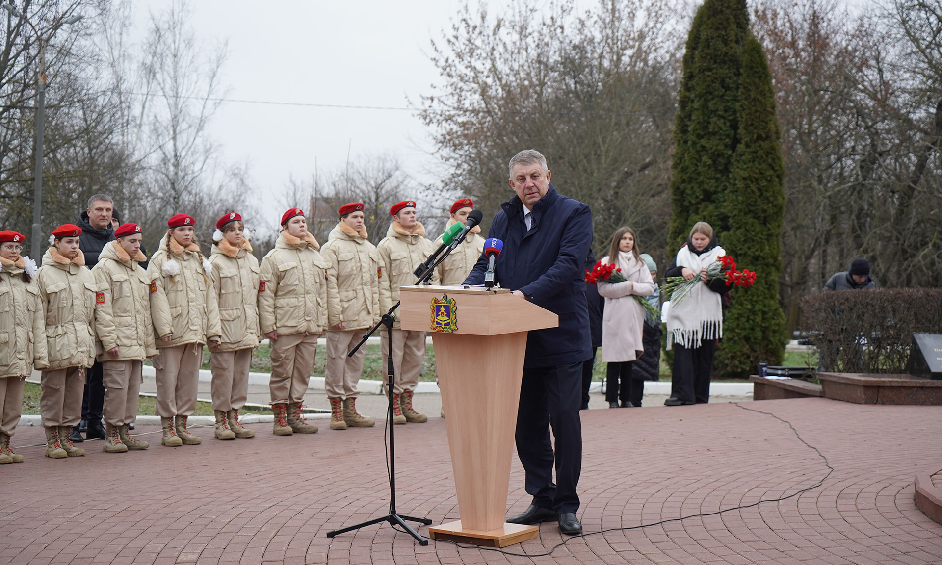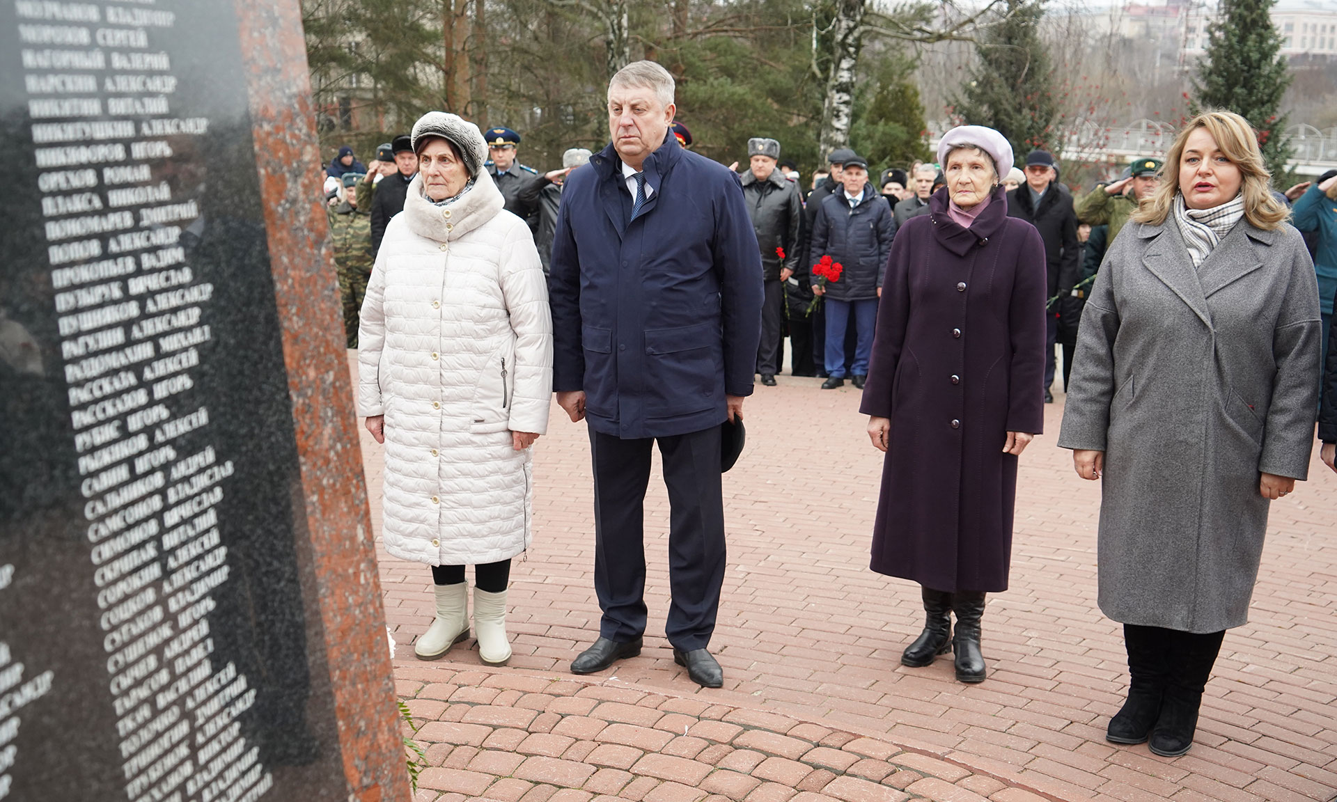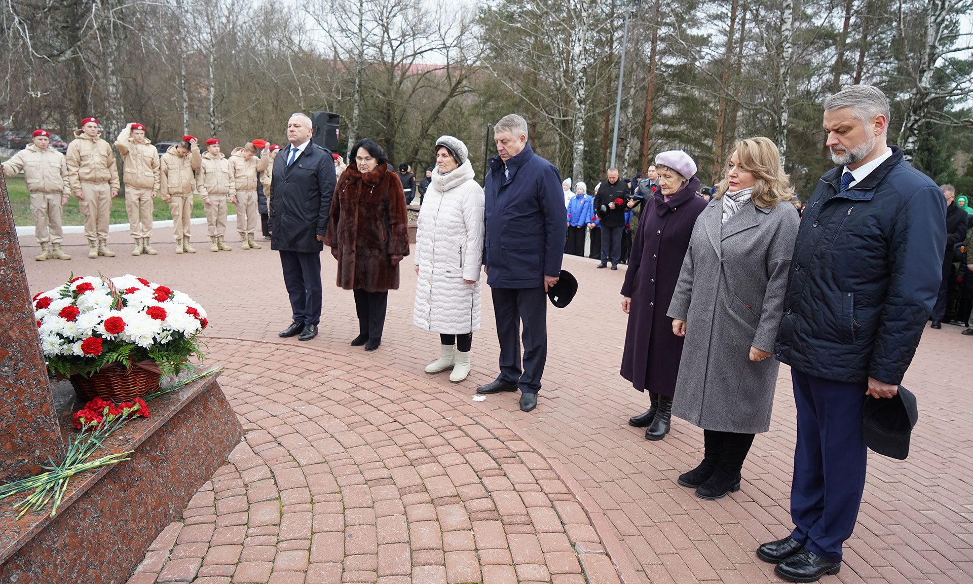 Цветы к бюстам Героев Российской Федерации Олега Ермакова, Сергея Василева, Алексея Рассказы, Александра Гердта, к бюсту удостоенного ордена Мужества Александра Трубенка, а также венок к памятнику «Круговая оборона» возложили Губернатор Александр Богомаз, мама Героя России Олега Ермакова Лидия Филипповна Ермакова, мама Героя России Сергея Василёва Галина Георгиевна Василёва, мама кавалера ордена Кутузова Федора Журавлева Людмила Федоровна Журавлева, мама кавалера ордена Мужества Дмитрия Седнева Марина Николаевна Седнева, председатель Брянской областной Думы Валентин Суббот и главный федеральный инспектор по Брянской области Андрей Дьячук. В мероприятии также приняли участие руководители судебных органов Брянской области, прокуратуры, правоохранительных органов и силовых структур Брянской области, заместители Губернатора Брянской области, руководители, города Брянска, председатели комитетов Брянской областной Думы, депутаты Брянского городского Совета народных депутатов, представители Брянской Епархии, общественных организаций, преподаватели и студенты высших образовательных организаций Брянской области, курсанты, кадеты, юнармейцы.